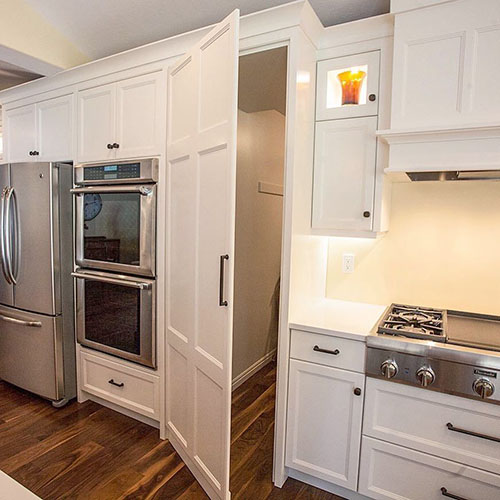 Выход в постирочную или хозяйственную зону оформляется под фасад кухонного гарнитура. Ручка-интегрированный профиль полностью скрывает назначение проёма.